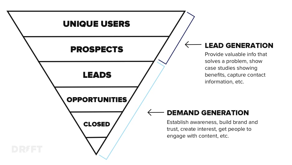 Because demand generation touches every part of the sales funnel, it’s unrealistic for marketers to handle all demand-related activities without crashing and burning. And while success is tracked against sales-specific KPIs like pipeline value and velocity, revenue, and average deal size, demand generation activities typically fall under the marketing umbrella—content, social media, drip campaigns, and so on.