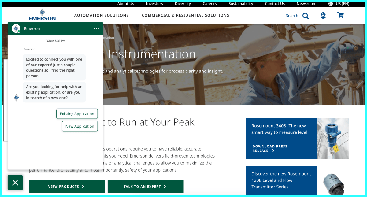 Already driving millions of web visits annually, the company wanted to ensure those sessions offered a better customer experience and a way to connect customers with subject matter experts. With the right tool in place, the Emerson team knew that they could reduce the time it takes for customers to get their needs met, replace form fills, capture intent, and deliver high-value leads directly to their product experts while reducing the time required for customers and prospects to get questions answered.