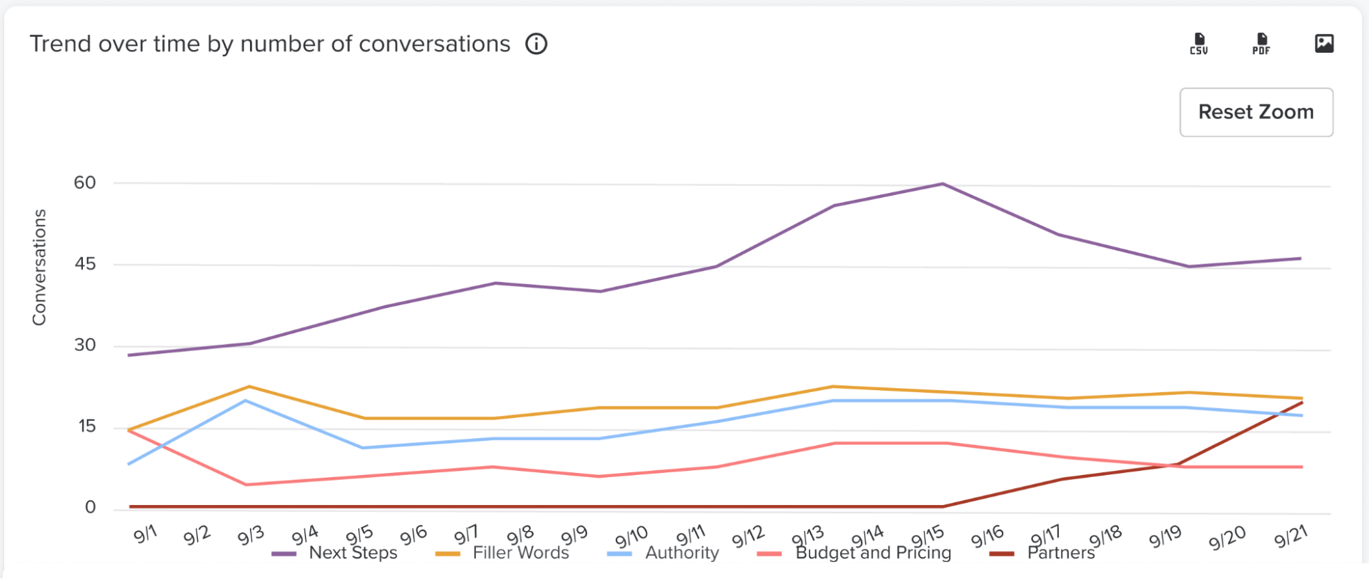The line chart gives a quick and easy snapshot of overall trends happening across Conversations, with the option to filter by date, owner, and Tracker Group/Term. Tracker Groups break down Conversations by different categories, such as next steps, filler words, authority, budget + pricing, and partners.