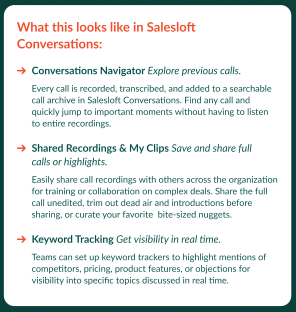 Only Salesloft’s Conversations works out of the box as part of a unified revenue workflow. By feeding actionable insights from every customer call into a focused revenue workflow, it helps teams like yours communicate better, follow up faster, and close deals more efficiently.