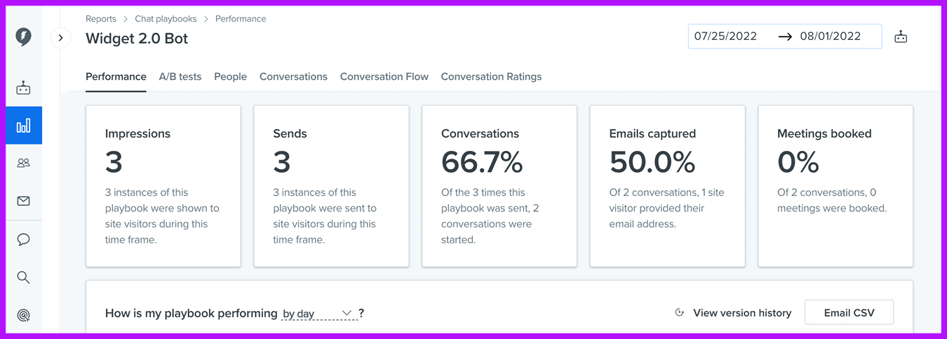 To increase the number of conversations you have, meetings you book, and leads you capture, you need to stay on top of your chat playbook performance.