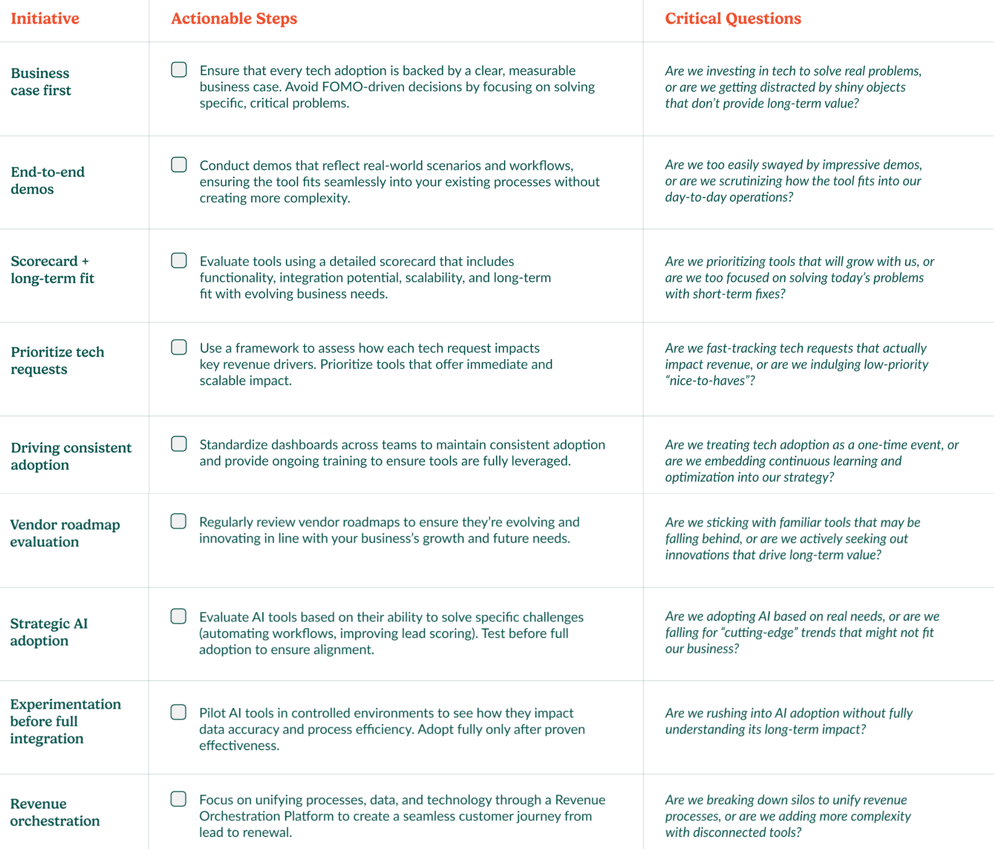No technology is effective unless it’s fully adopted across the organization. RevOps leaders must create a structured plan for training, ongoing support, and monitoring to ensure high adoption rates.